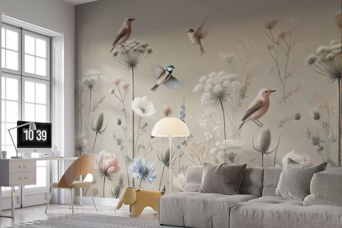 Valokuvatapetti Herkät luonnonkukat ja linnut beigellä pohjalla Nr w01958