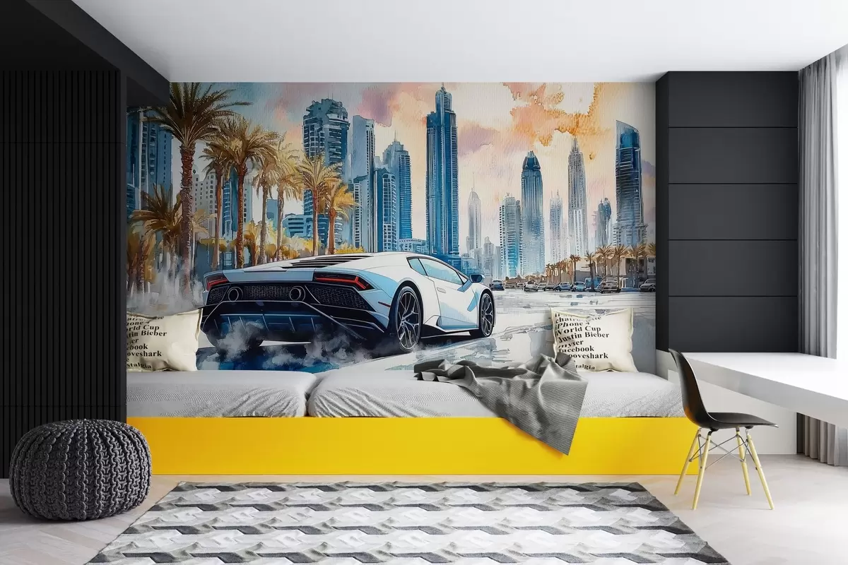 Valokuvatapetti Valkoinen moderni urheiluauto kilpa vastaan taustalla palmuja ja pilvenpiirtäjiä vapaa vesiväritekniikalla Nr w01963