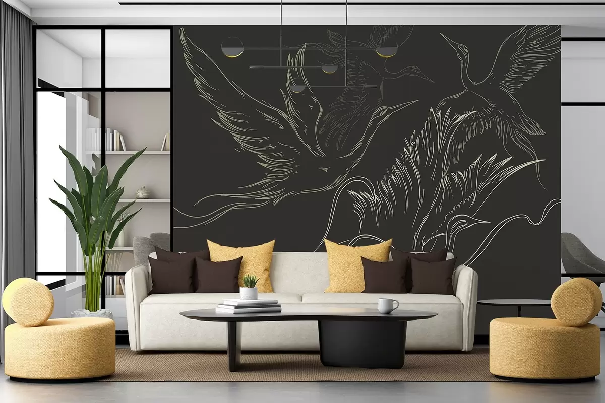 Valokuvatapetti Linnut lentävät, minimalismi, viivataidetta, luonto, tumma tausta Nr w02061v3