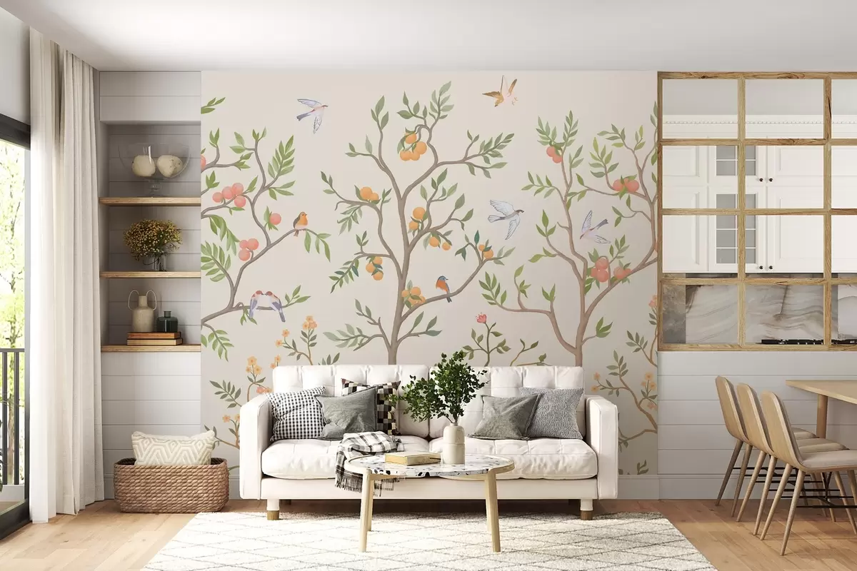 Valokuvatapetti Chinoiserie-suunnittelu, jossa on lintuja, kiemurtelevia puita, hedelmiä ja kukkia Nr w02128
