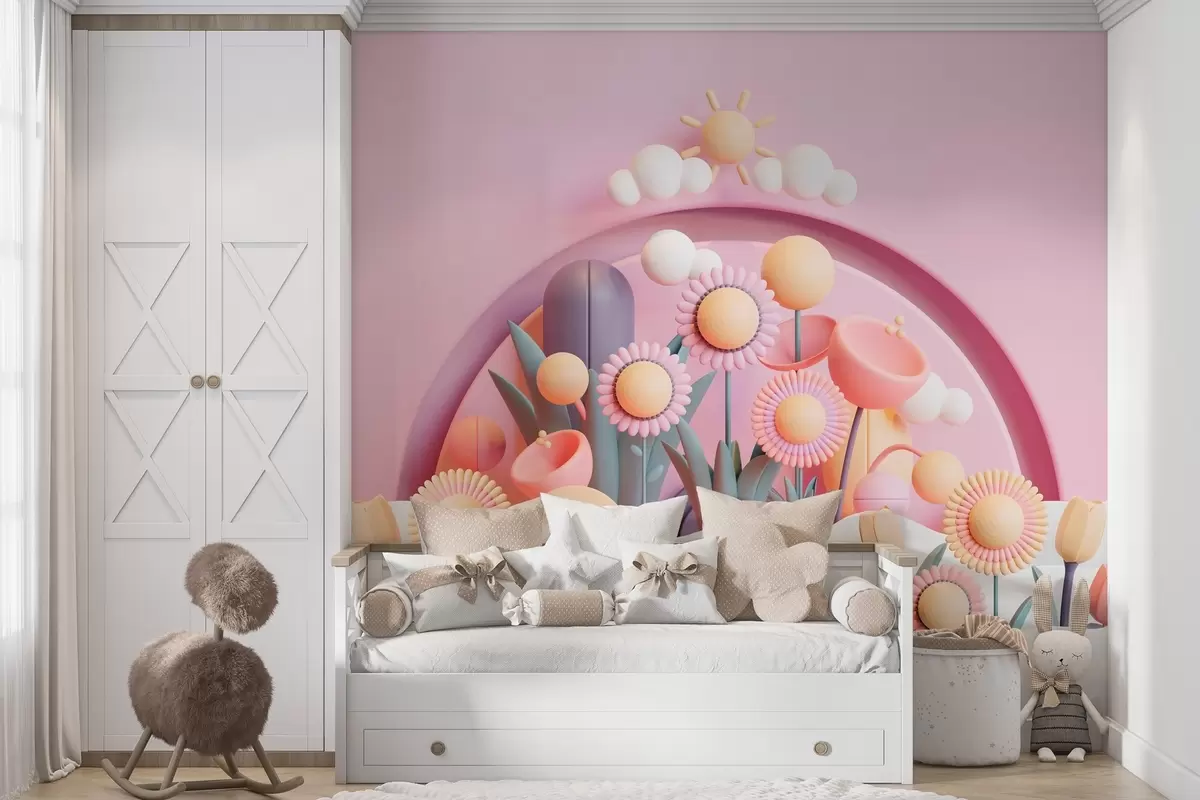 Valokuvatapetti Lasten taustakuva 3D-tyyliin, jossa on kukkia ja pilviä vaaleanpunaisissa sävyissä Nr w02136