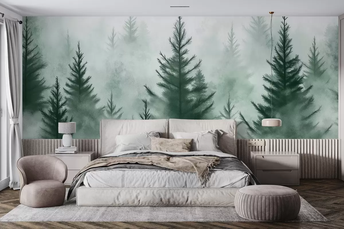 Valokuvatapetti Metsä sumussa, mäntyjä, akvarelli, vihreät värit Nr w02152v1