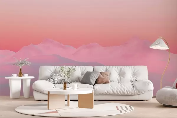 Valokuvatapetti Pehmeä vadelmanvärinen auringonlasku vuorten ja taivaan taustaa vasten Nr w02234