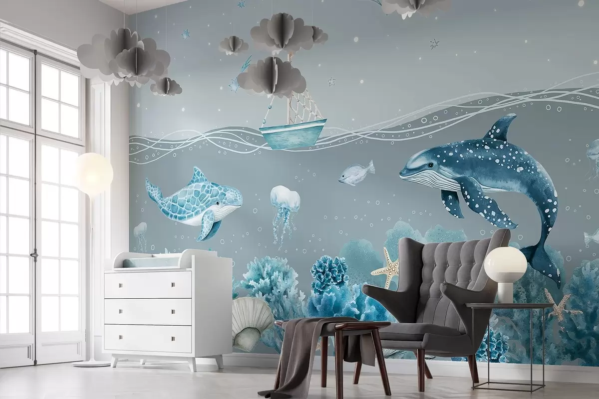 Valokuvatapetti Meren elämää, akvarellityyli, korallit, vene, delfiini, meduusa, tähtitaivas, pehmeät siniset värit Nr w02310v3