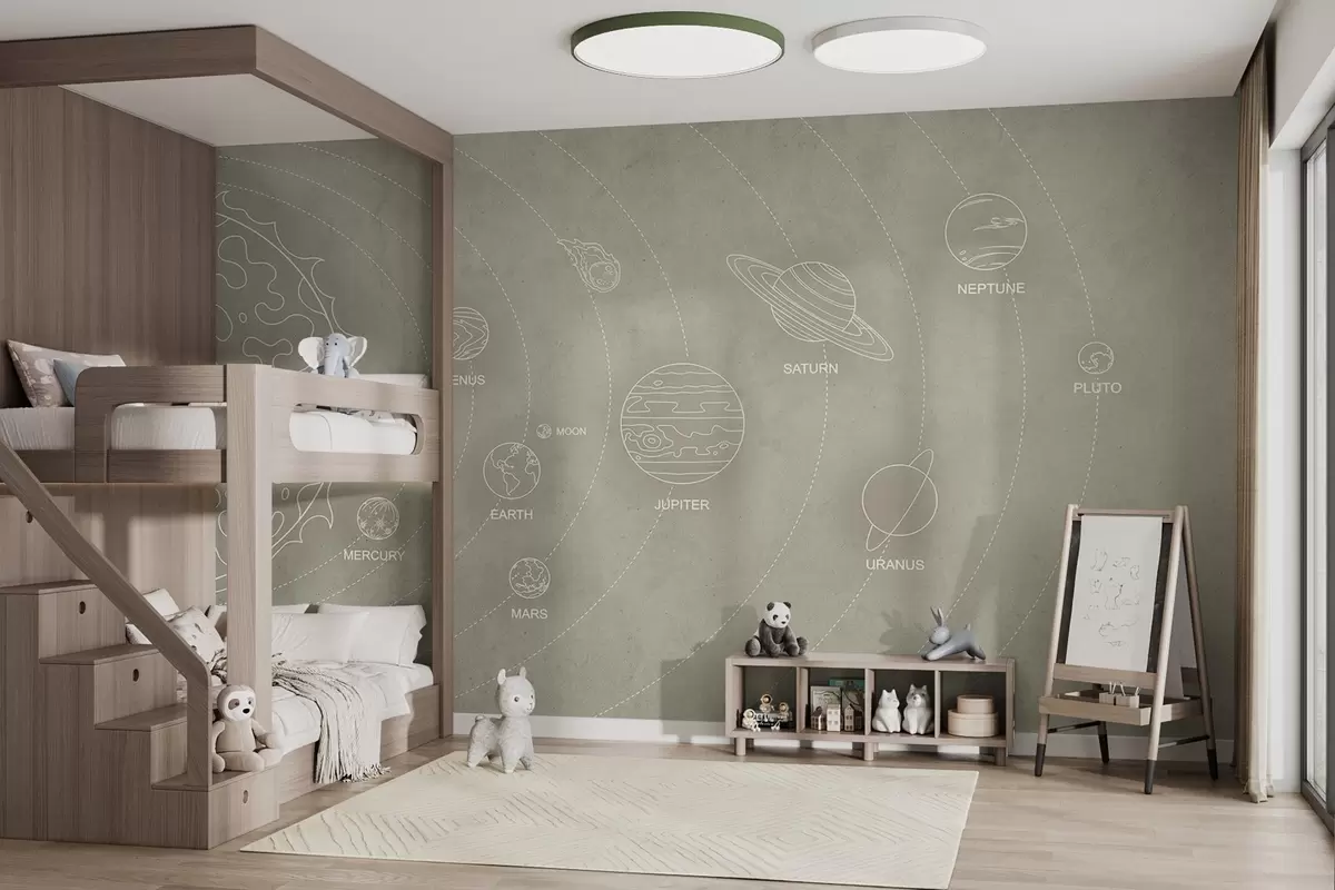 Valokuvatapetti Aurinkokunta minimalistiseen tyyliin viileällä beigellä kuvioidulla taustalla Nr w02344