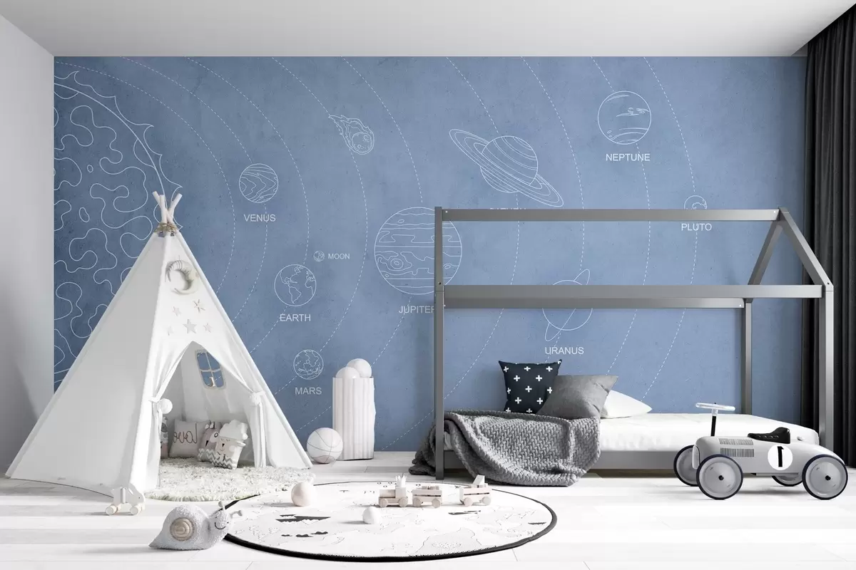 Valokuvatapetti Aurinkokunta minimalistiseen tyyliin sinisellä kuvioidulla taustalla Nr w02344v1