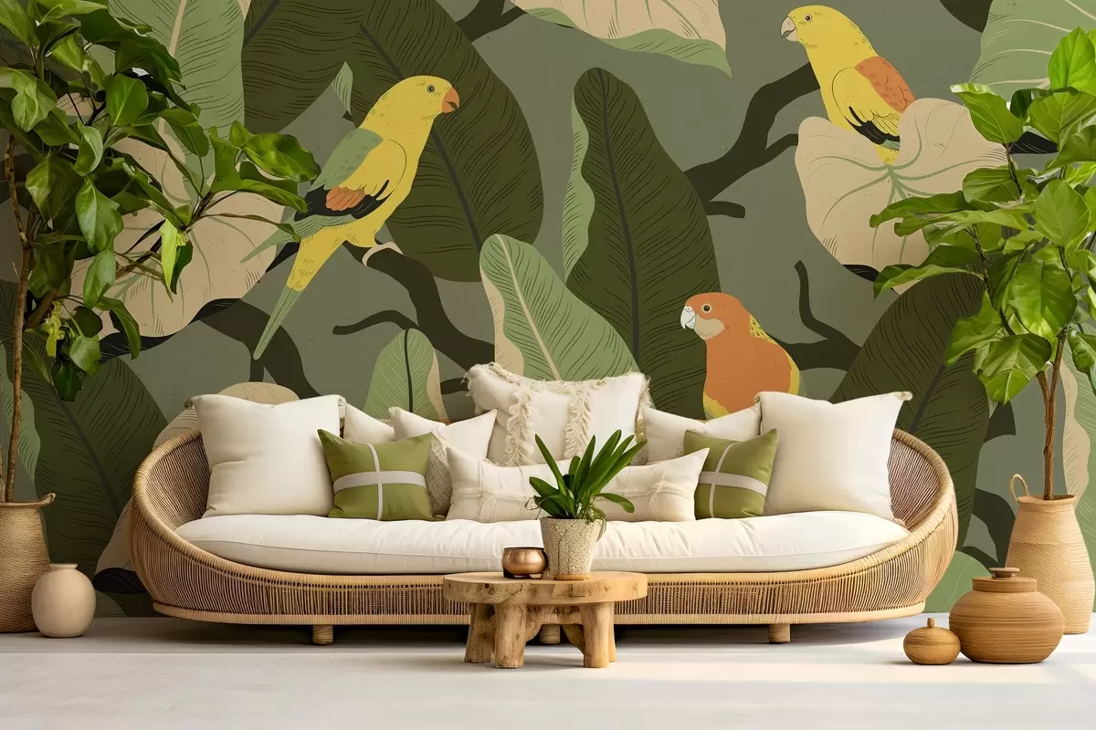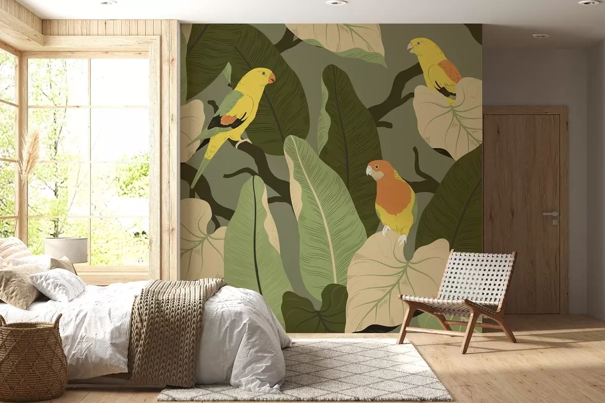Valokuvatapetti trooppiset lehdet papukaijojen kanssa Nr w02402