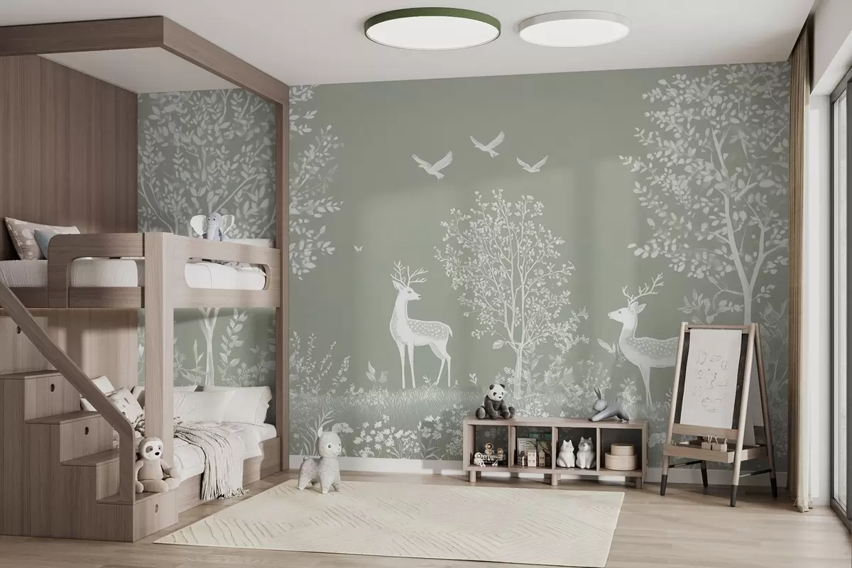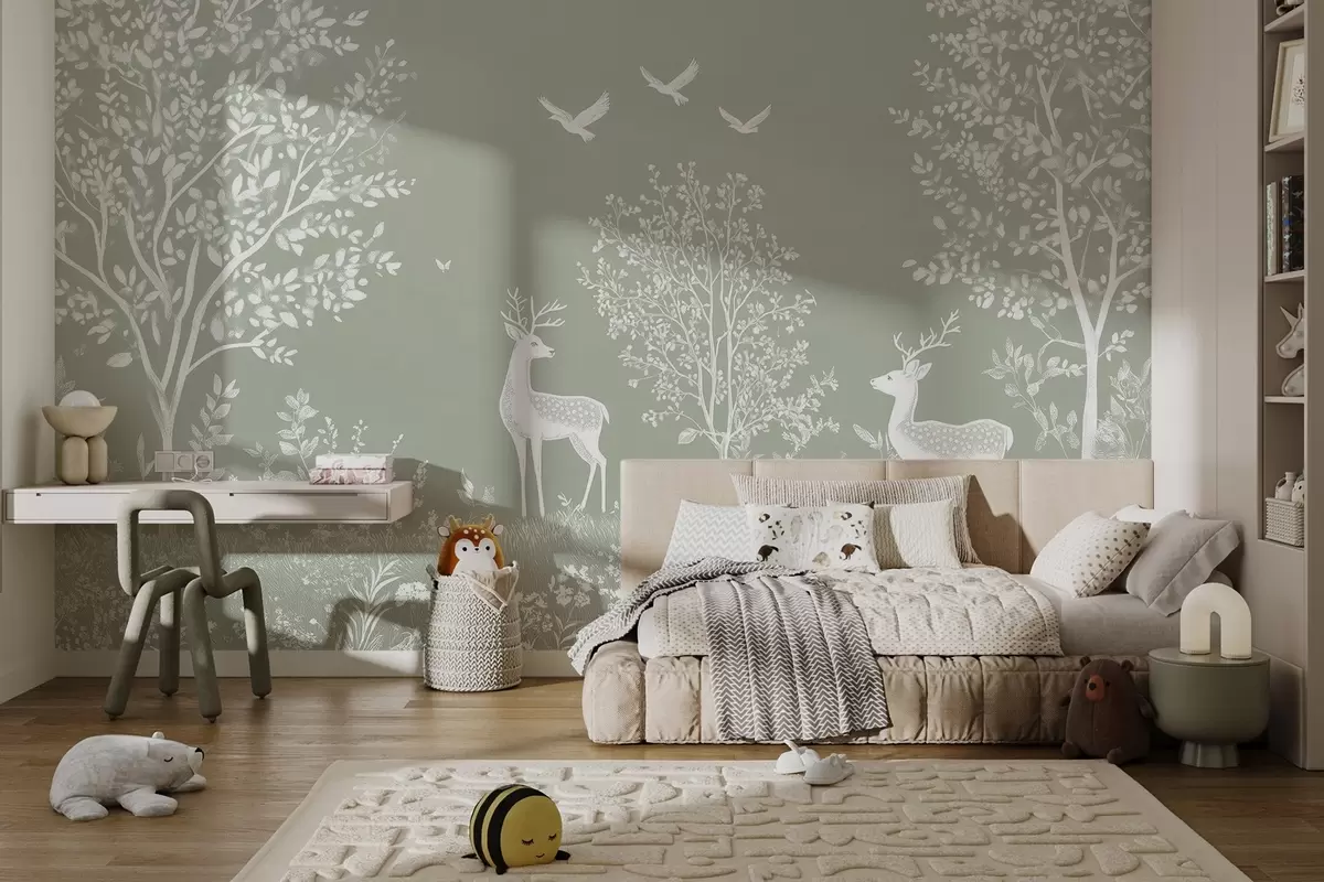 Valokuvatapetti metsä, jossa on peuroja liitupiirroksen tyyliin oliivitaustalla Nr w02444v1