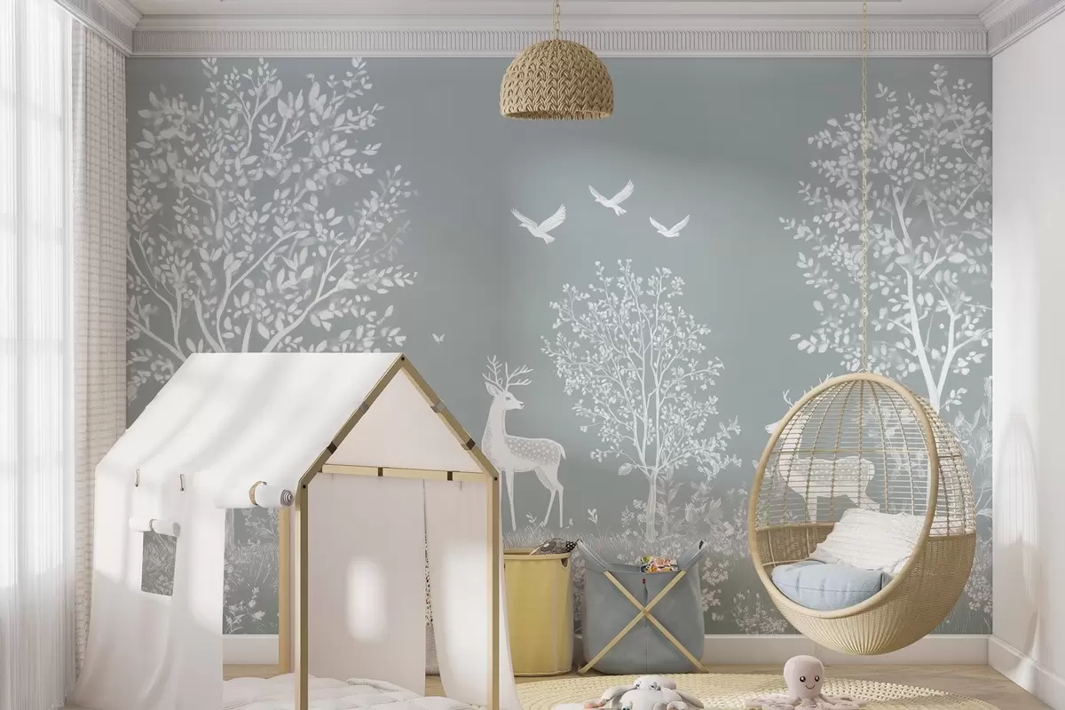 Valokuvatapetti metsä, jossa on peuroja liitupiirroksen tyyliin harmaalla pohjalla Nr w02444v2