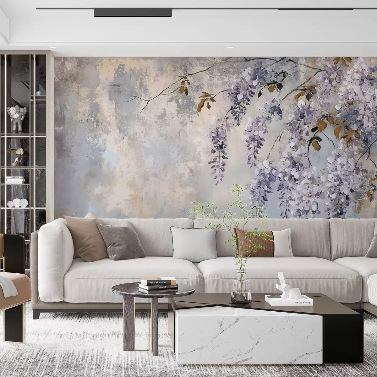 Valokuvatapetti kuvioitu tapetti pehmeissä, hillityissä väreissä, joissa on hentoja wisterian kukkia ja oksia. Nr w02451