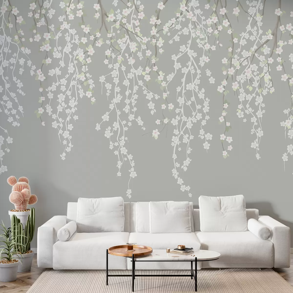 Valokuvatapetti Virtaava herkkä oksat kukkia harmaalla taustalla Nr w02479v1