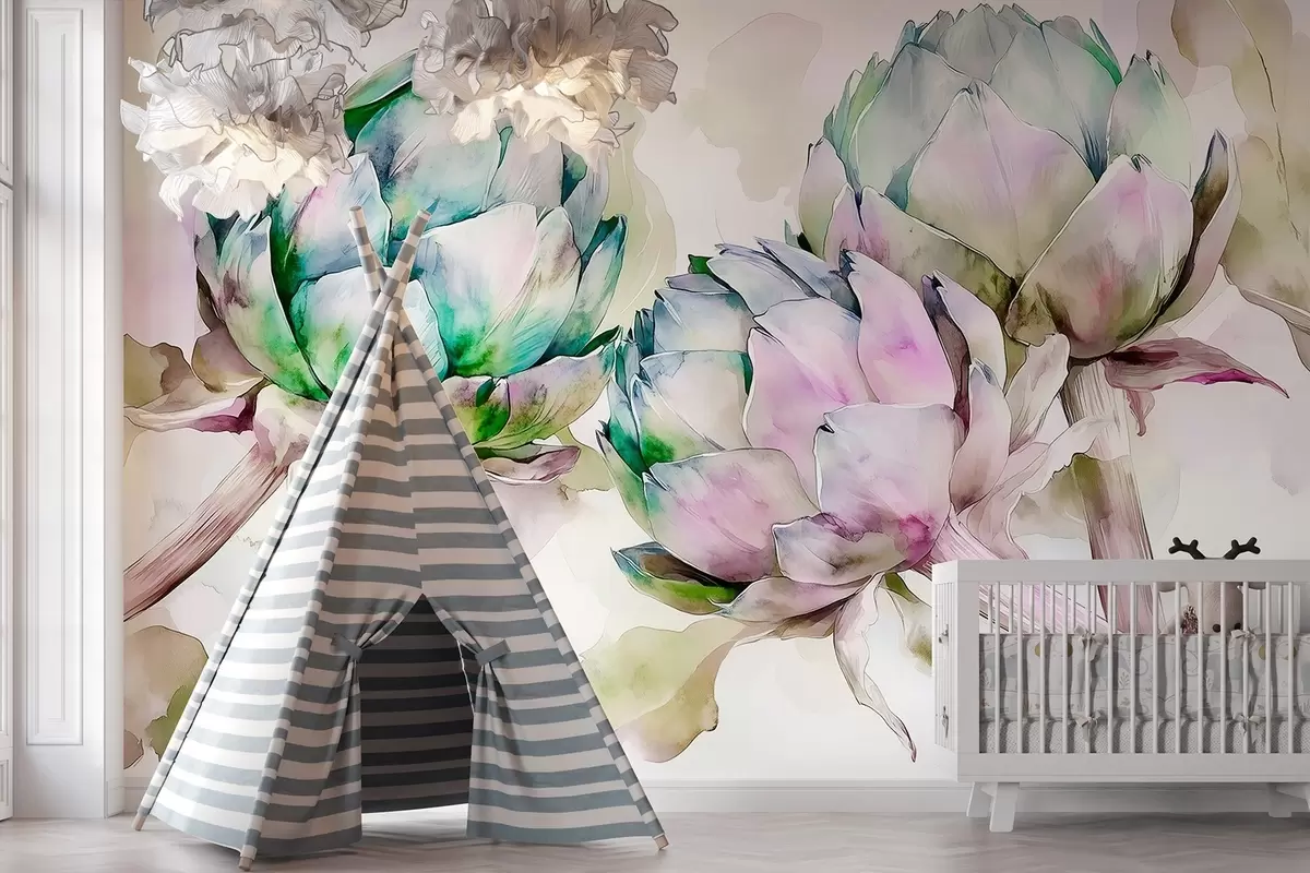 Valokuvatapetti Artisokat vesivärityyliin, kukkia, violetti ja vihreä Nr w02481