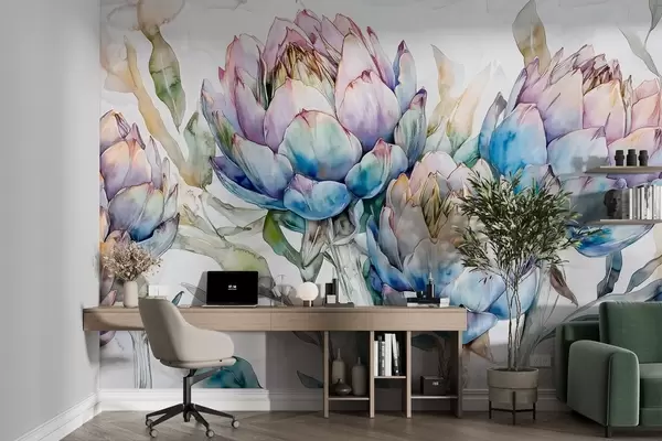 Valokuvatapetti Artisokkien piirustus, vesivärityyli, kukka, violetti, beige, vihreä Nr w02484
