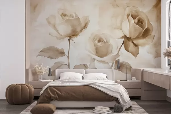 Valokuvatapetti Beige ruusut, kukat, pehmeä akvarellipiirustus, maalaismainen, boheemi Nr w02490