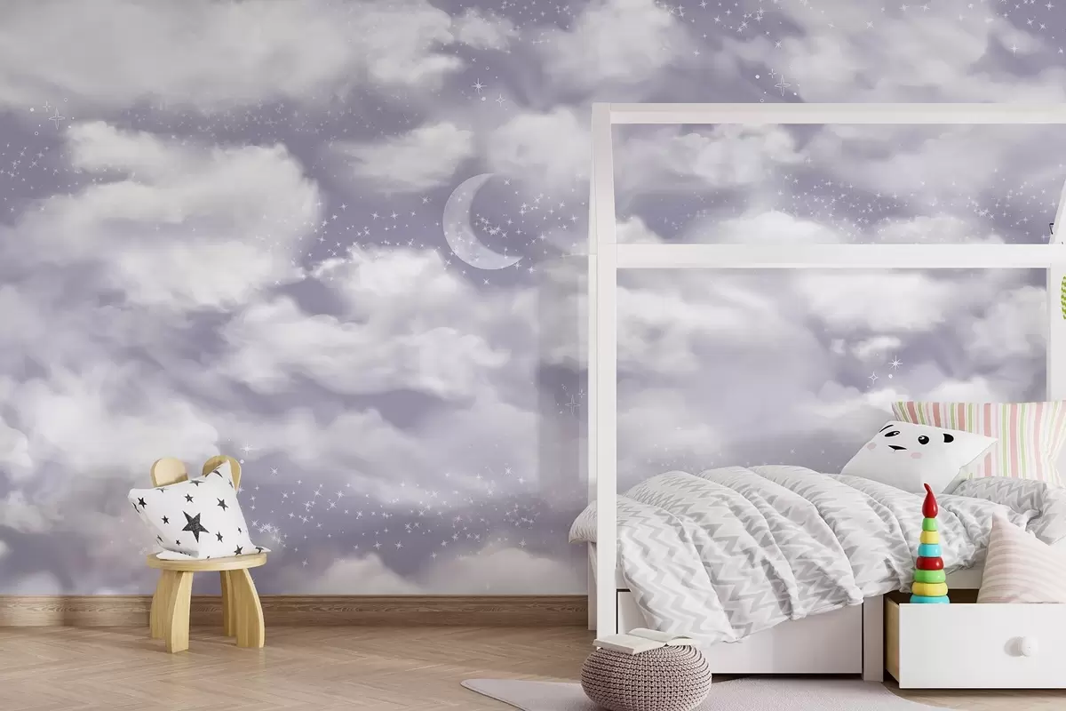 Valokuvatapetti Tähtitaivas kuun ja pilvien kanssa, unenomainen, eteerinen, pehmeät violetit värit Nr w02515v4