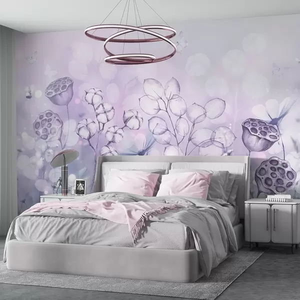 Valokuvatapetti Unenomainen kukkapuutarha, perhonen, puuvillakukat, lootukset, violetit värit Nr w02516v1