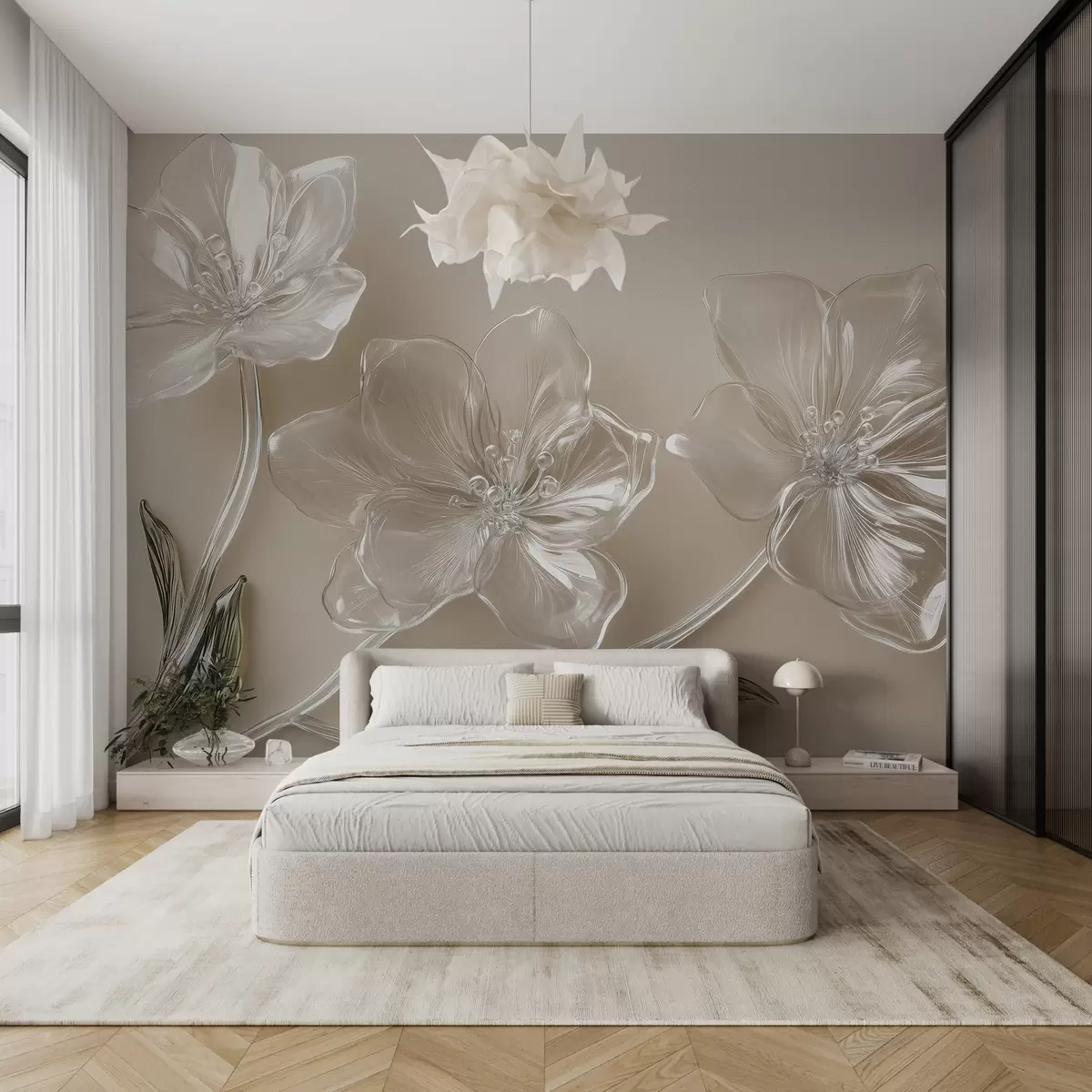 Valokuvatapetti suuria kukkia jäljitelmä lasi beige tausta Nr w02518