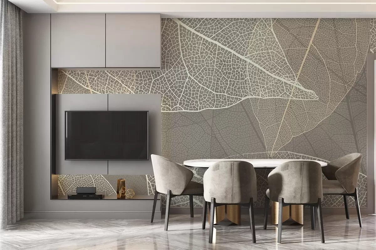 Valokuvatapetti lähikuva lehdistä, joiden suonet ovat lämpimän harmaan sävyjä Nr w02520v2