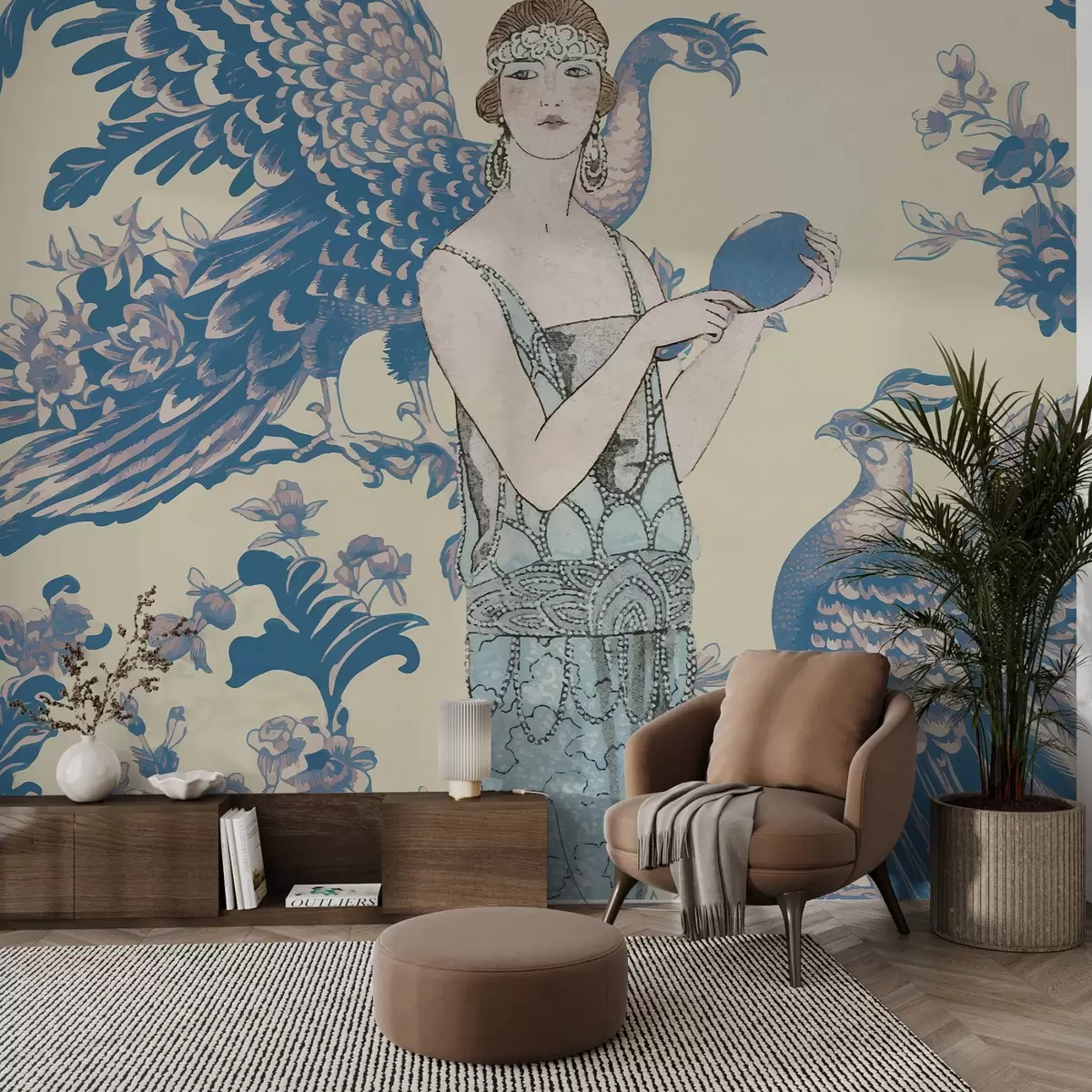 Valokuvatapetti Elegantti vintage kukka kuvio nainen sininen ja vaaleanpunainen sävyjä Nr w02532