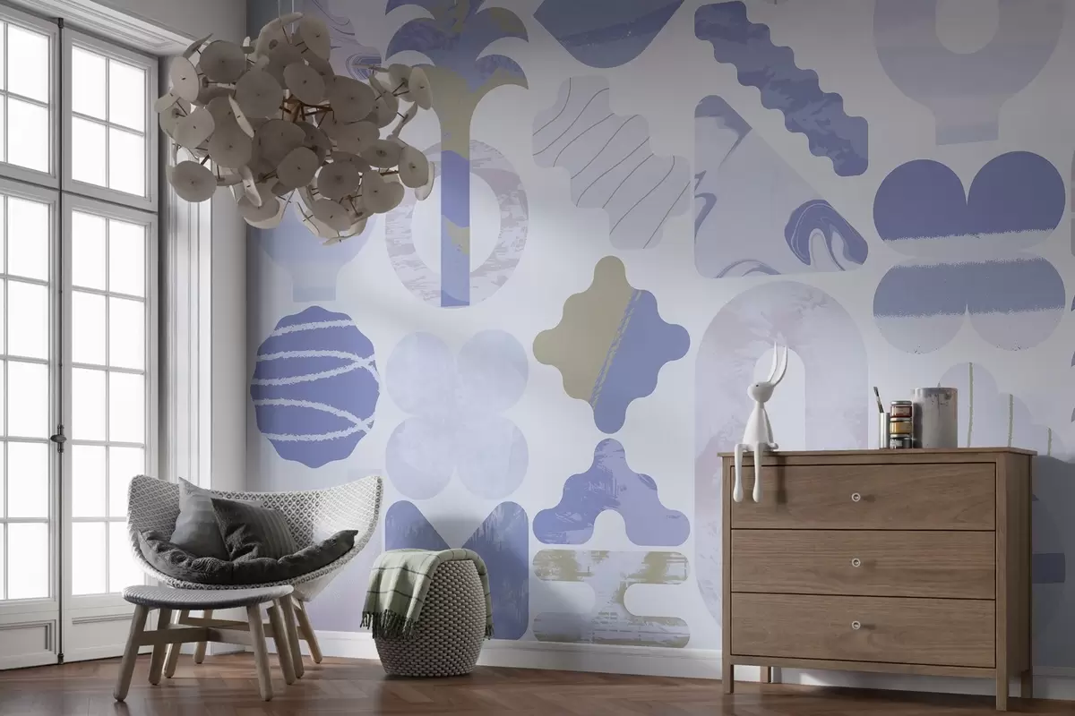Valokuvatapetti erilaisia mielenkiintoisia muotoja, modernia geometriaa sinisissä sävyissä w02550v1