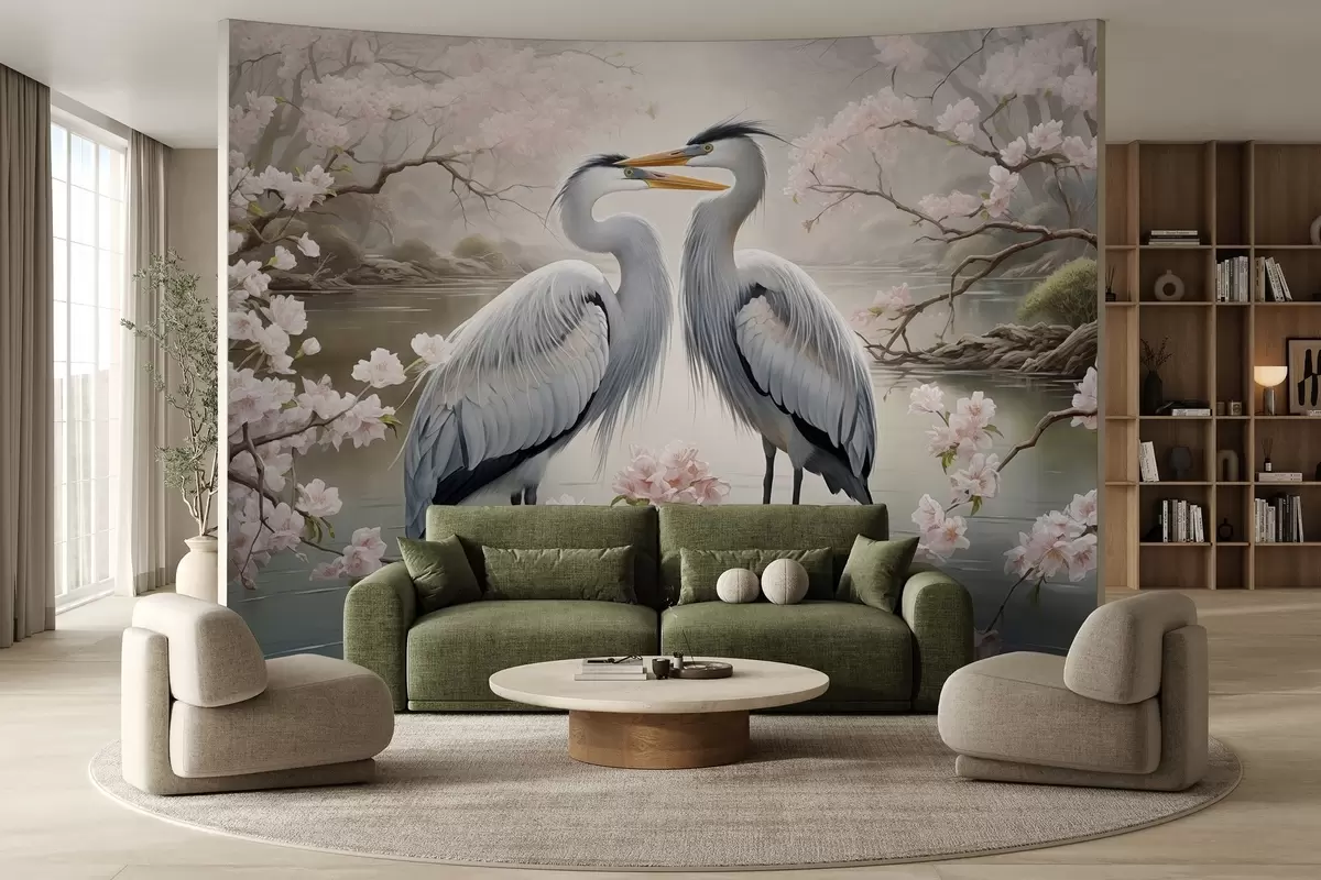 Valokuvatapetti Haikarapari kukkivassa puutarhassa Nr w02621