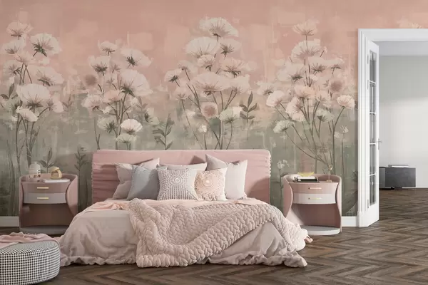 Valokuvatapetti Herkkä luonnonkukkia siveltimenvedolla vaikutus vaaleanpunainen Nr w02629