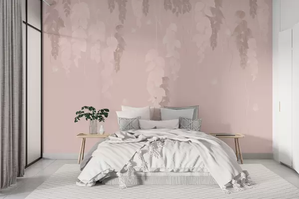 Valokuvatapetti Roikkuvat lehdet ja perhoset vaaleanpunaisena Nr w02655