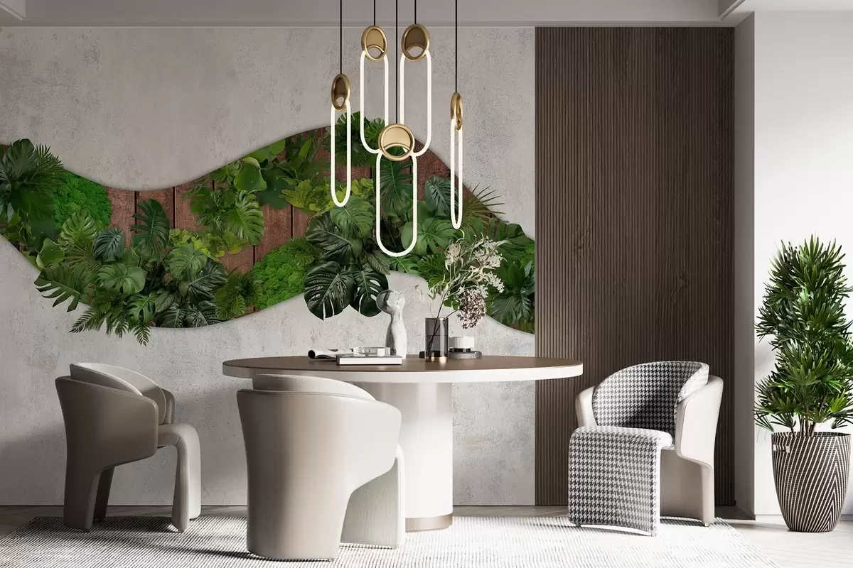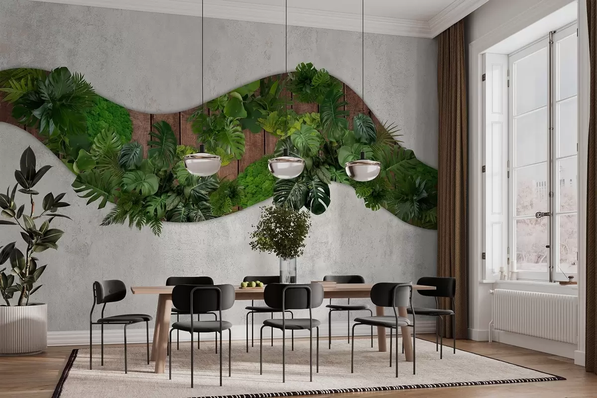 Valokuvatapetti Seinäkoriste kasveilla, sammal, palmunlehdet, puinen tausta Nr w02658