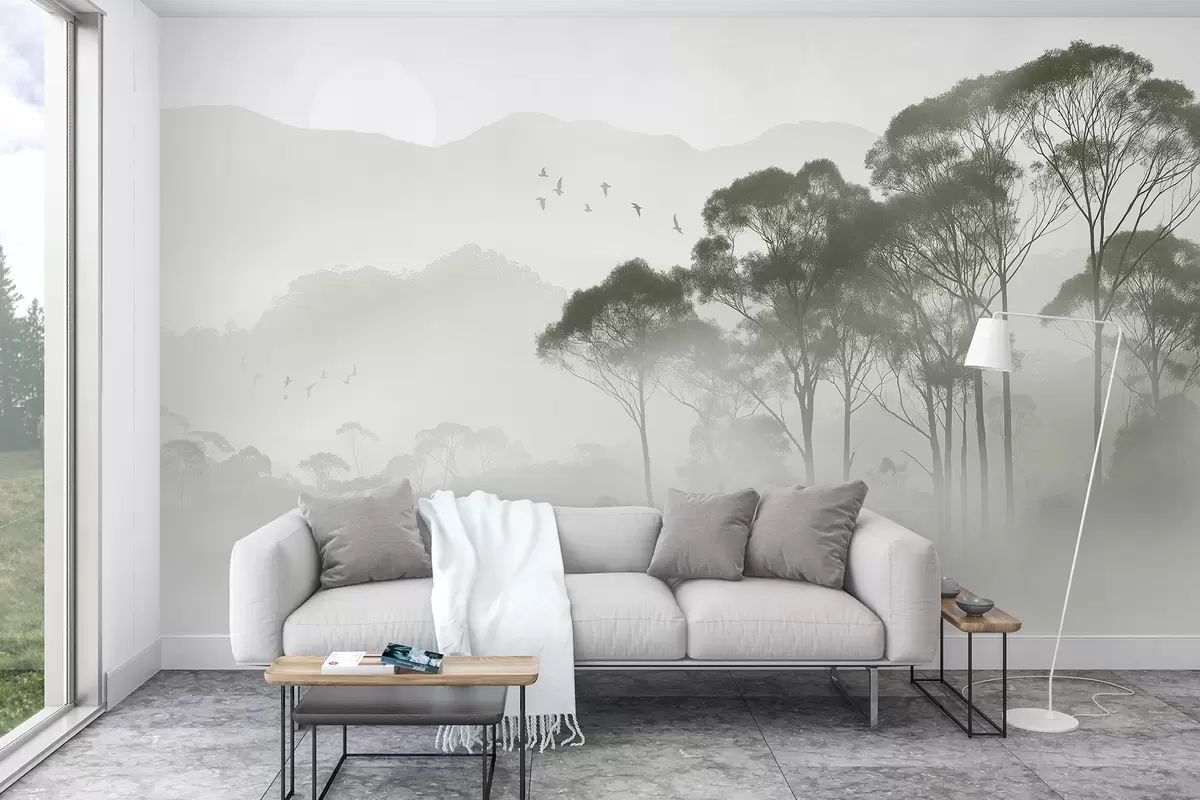Valokuvatapetti Puut sumussa, luontomaisemat, linnut, aurinko, vihreät värit Nr w02740
