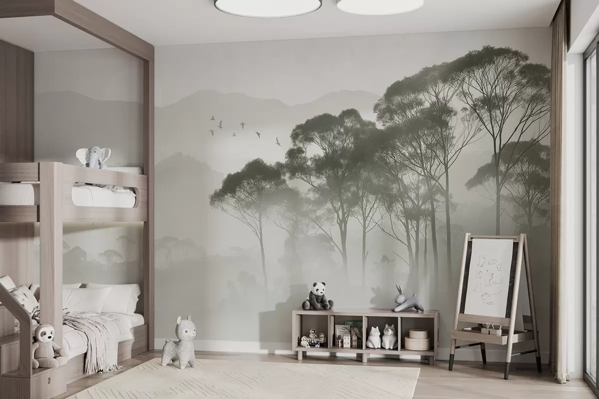 Valokuvatapetti Puut sumussa, luontomaisemat, linnut, aurinko, vihreät värit w02740