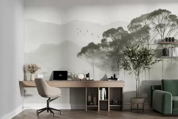 Valokuvatapetti Puut sumussa, luontomaisemat, linnut, aurinko, vihreät värit Nr w02740