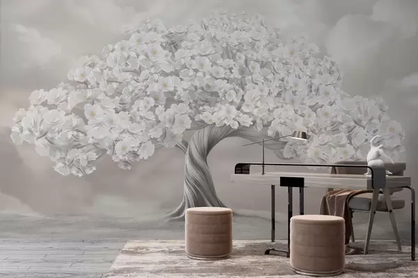 Valokuvatapetti Suuri puu kukkia ja pilviä taustalla pastellivärit Nr w02748v1