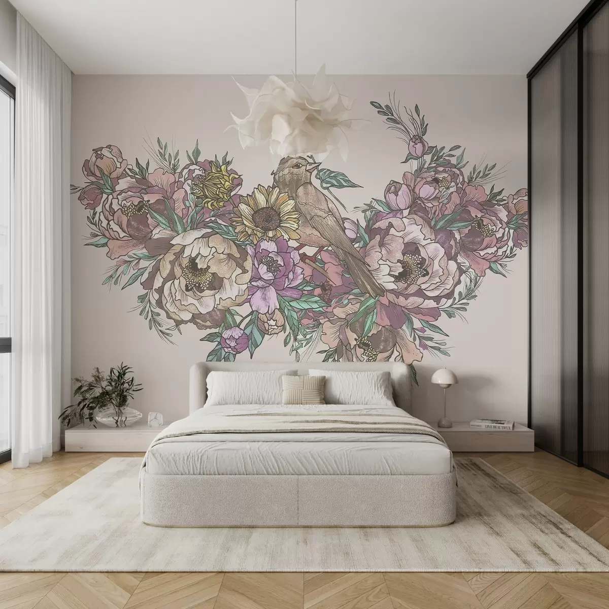 Valokuvatapetti Vintage lintu ja kukka kuvitus Nr w02833