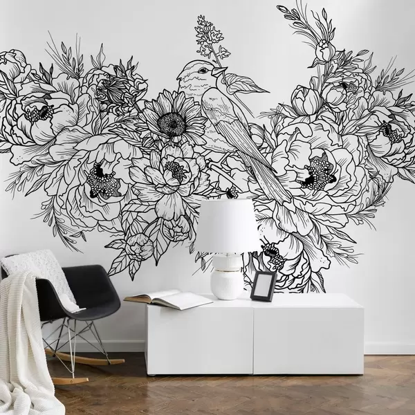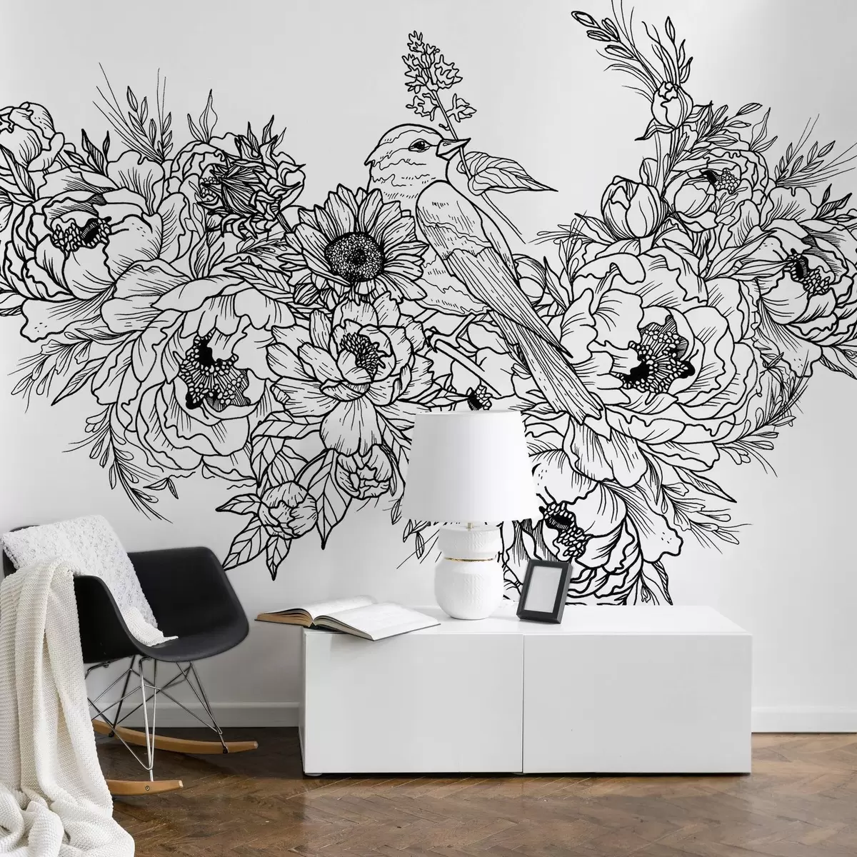 Valokuvatapetti Yksityiskohtainen Line Art lintu ja kukka-asetelma Nr w02833v1