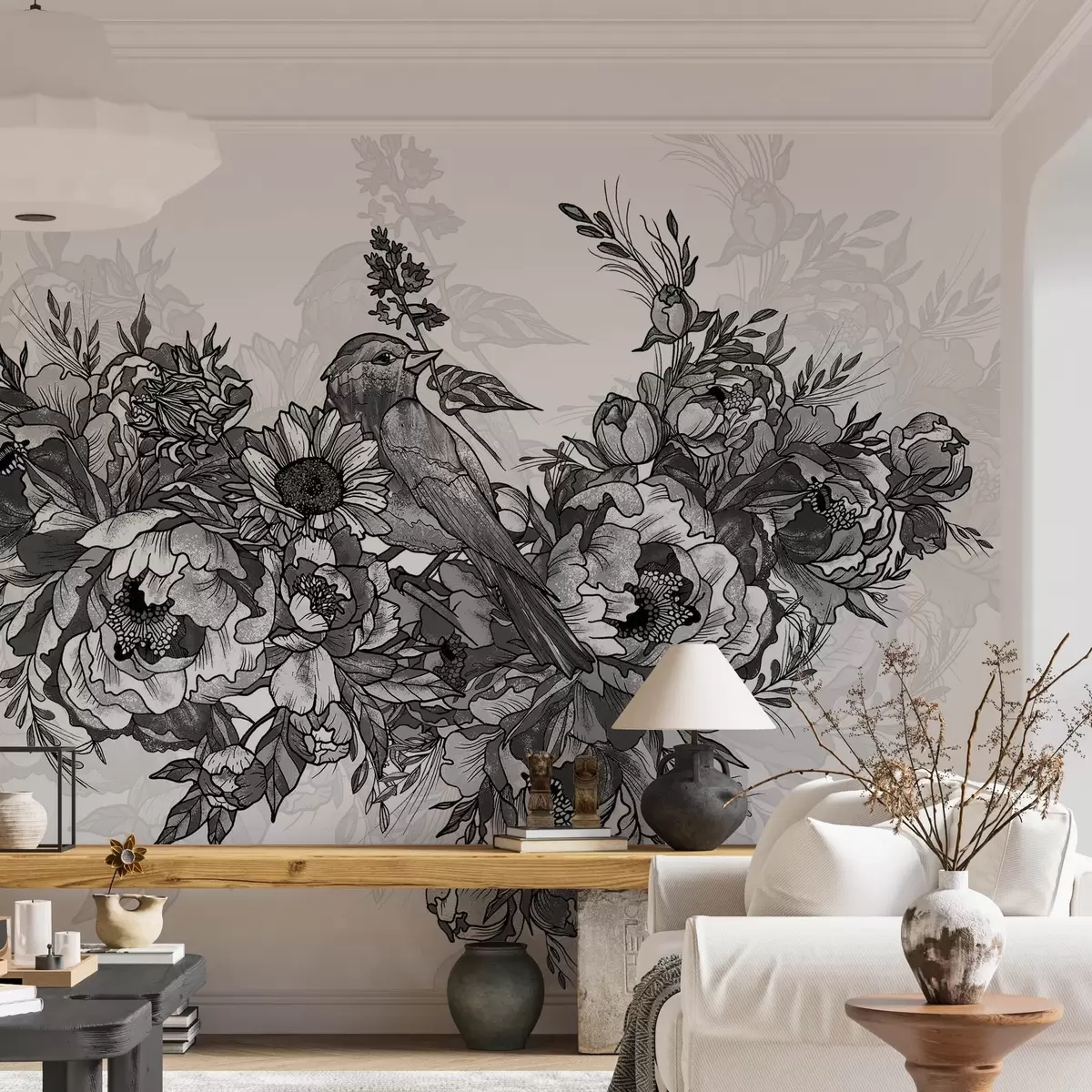 Valokuvatapetti Yksivärinen kukka ja lintu koostumus Nr w02834