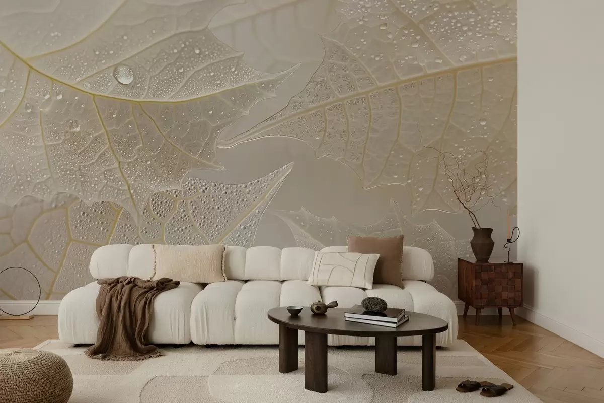Valokuvatapetti Lähikuva lehdistä, joissa on suonet ja kastepisarat beigen sävyisinä Nr w02872