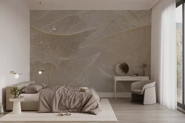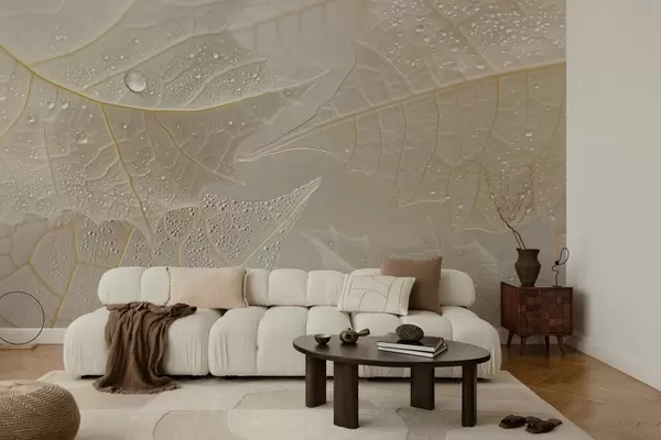 Valokuvatapetti Lähikuva lehdistä, joissa on suonet ja kastepisarat beigen sävyisinä Nr w02872