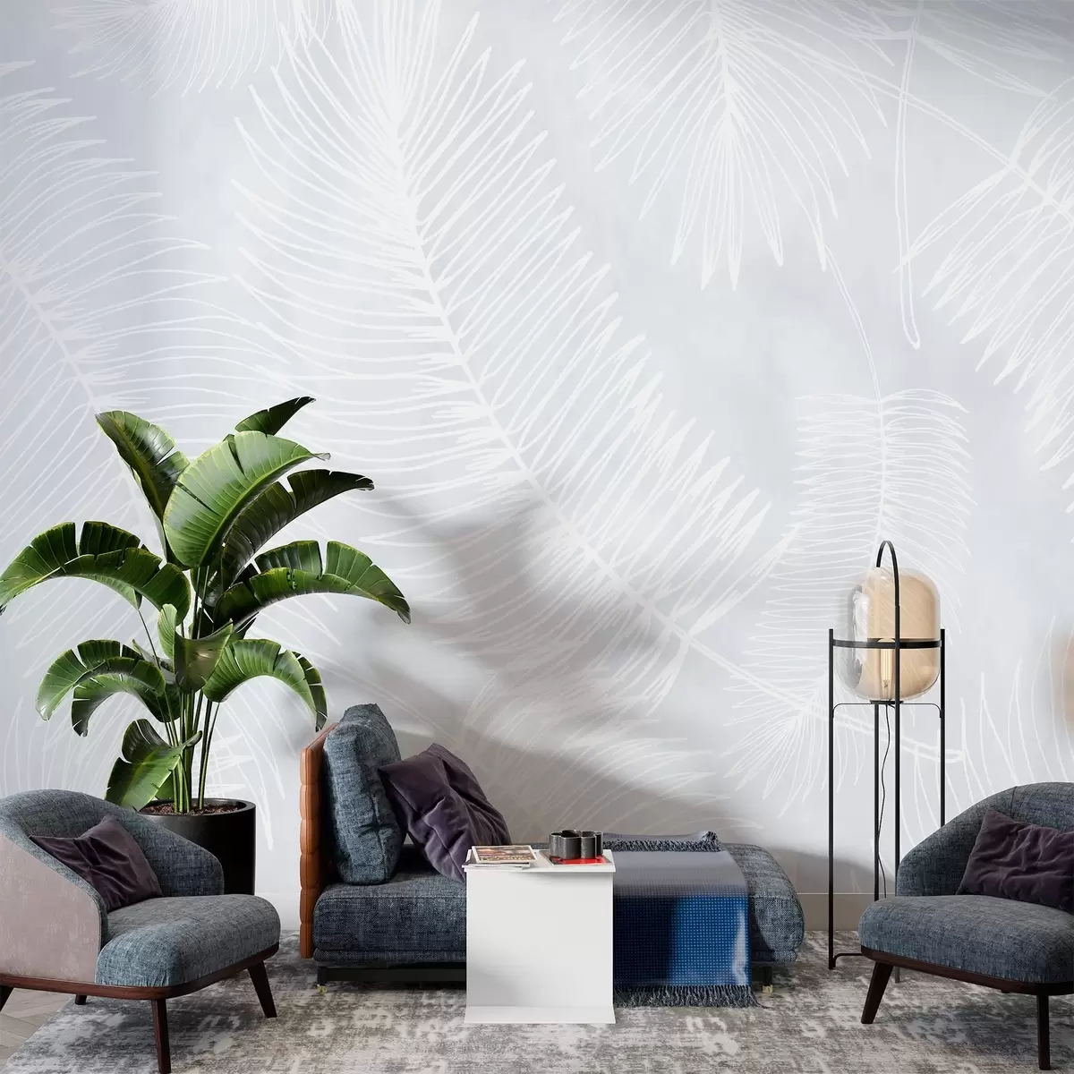 Valokuvatapetti Valkoiset lehtien siluetit kuvioidulla taustalla Nr w02894v1