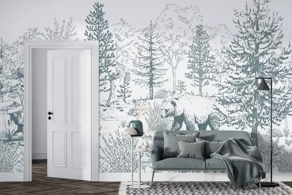 Valokuvatapetti Metsäelämää, puita, villieläimiä, karhu, kettu, pöllö, pensaita, lyijykynätyylinen piirustus, siniset värit Nr w02929v1