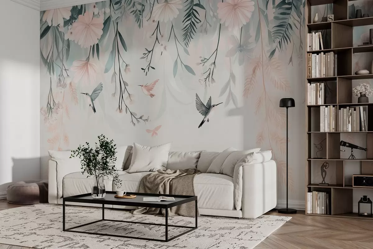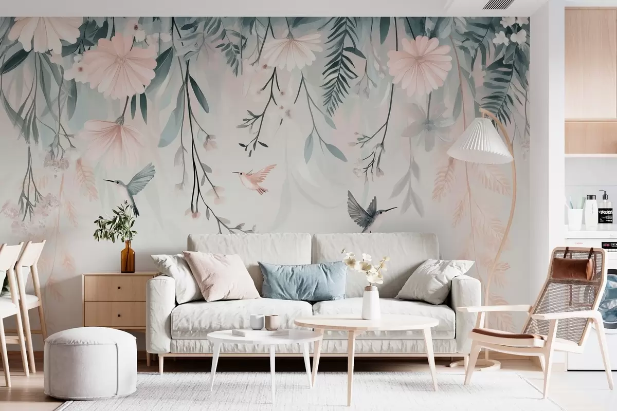 Valokuvatapetti vaaleanpunaisia kukkia jäljittelemällä maalaustekniikkaa roikkuu ylhäältäpäin Nr w03012