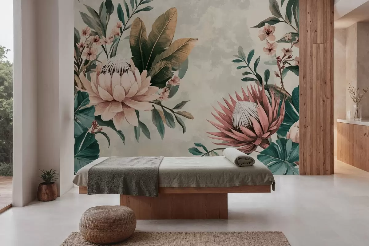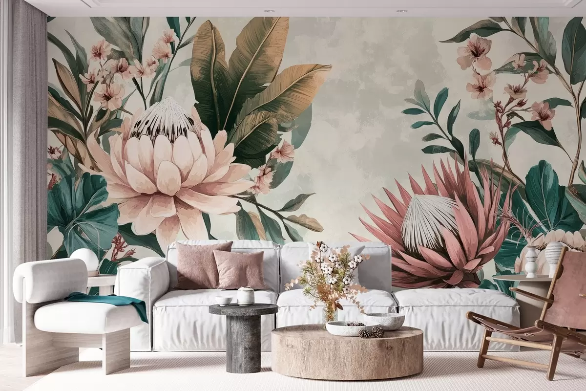 Valokuvatapetti eksoottisia kasveja, palmunlehtiä ja protea kukkia, joiden inspiraationa on vintage Nr w03015