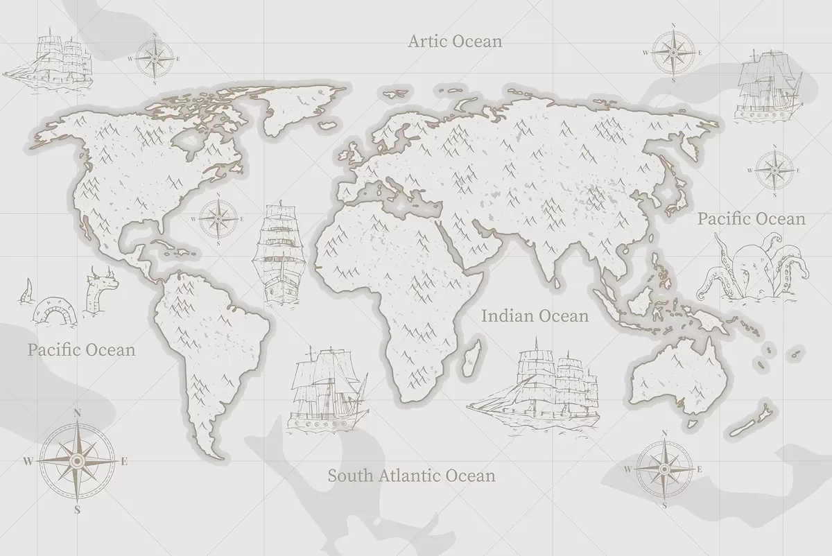 Valokuvatapetti Maailmankartta, laivoja, vaaleanharmaa tausta Nr w03044v1
