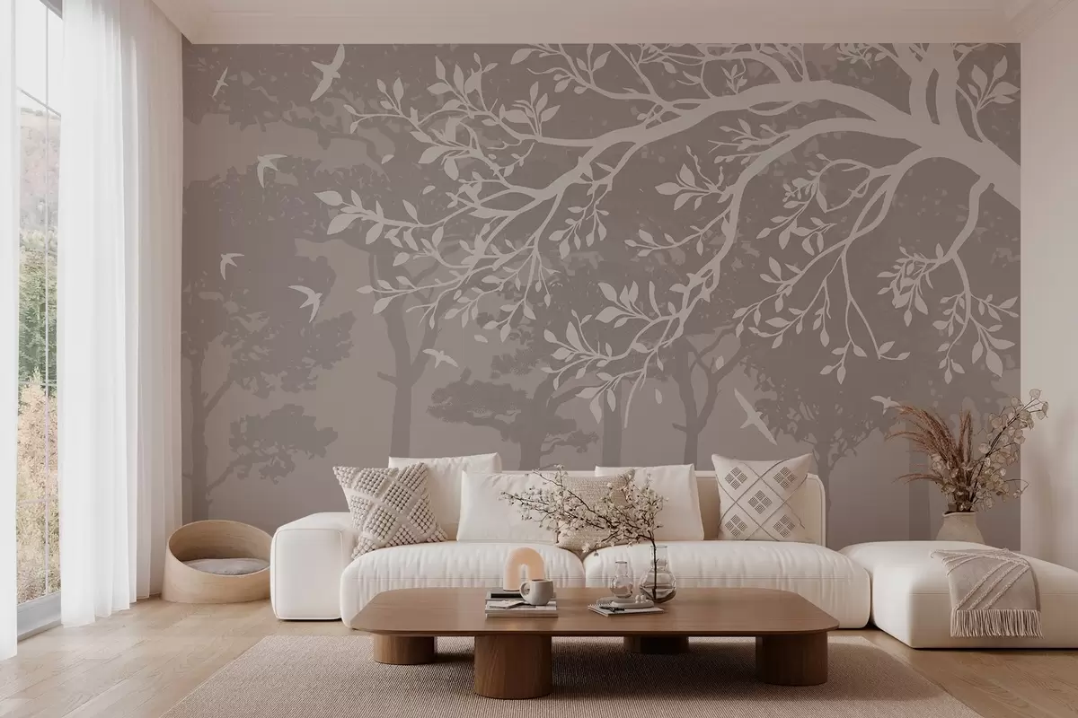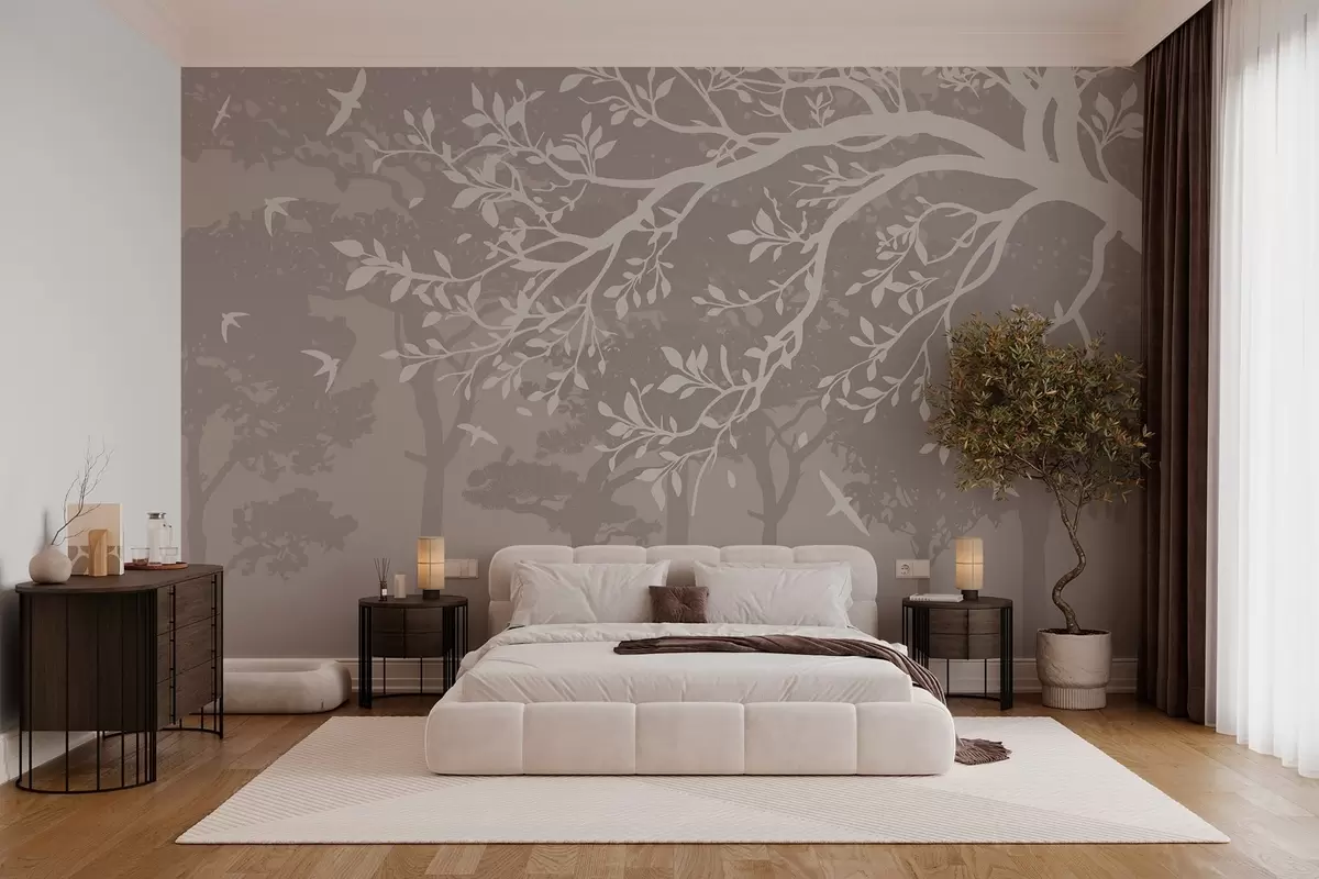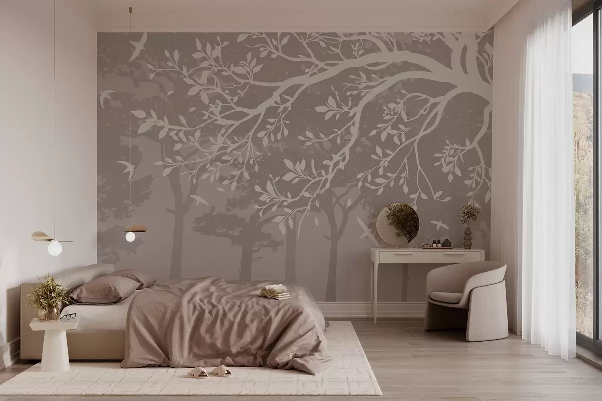 Valokuvatapetti kermanvärisen puun oksan siluetti lintujen kanssa metsän taustalla Nr w03116