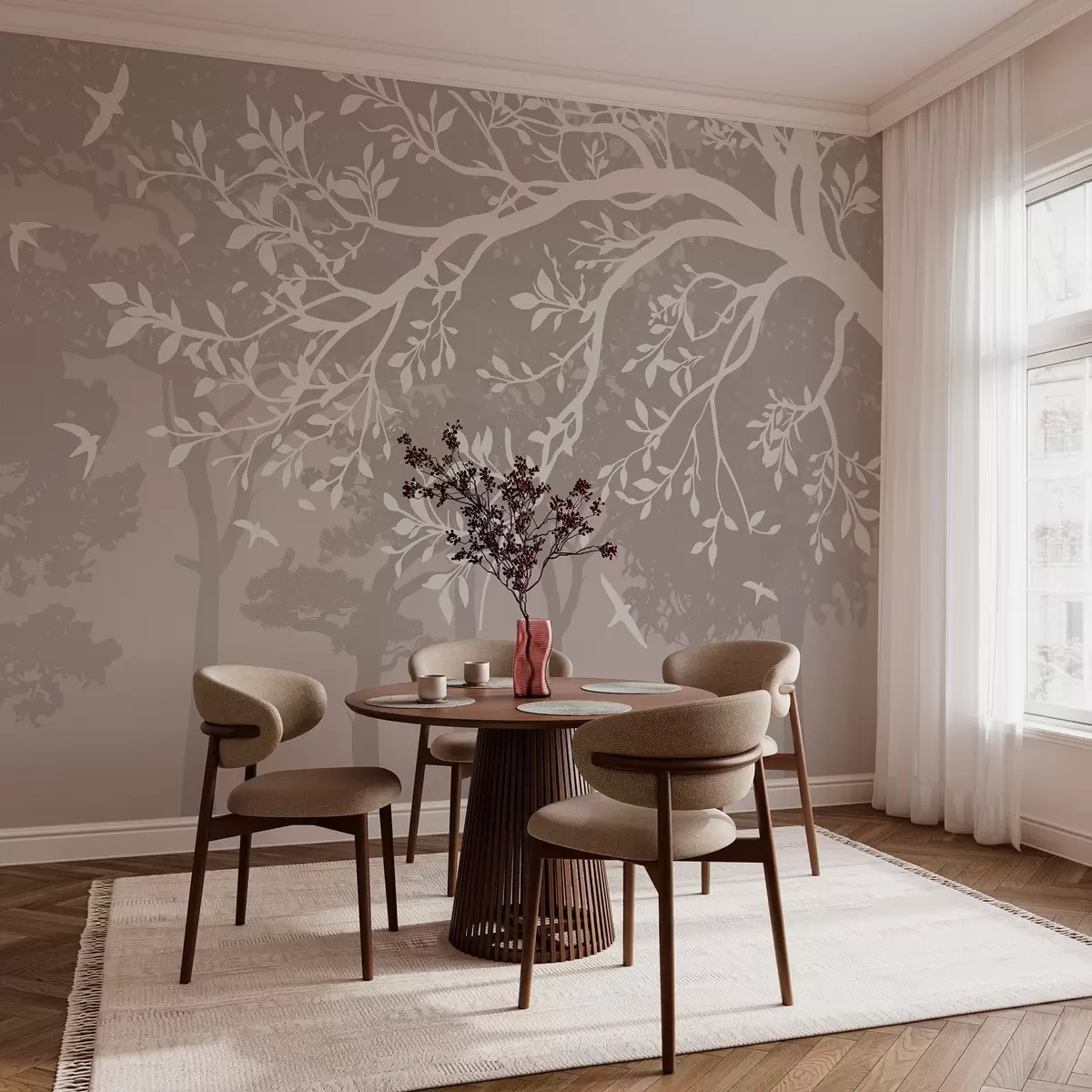 Valokuvatapetti kermanvärisen puun oksan siluetti lintujen kanssa metsän taustalla Nr w03116