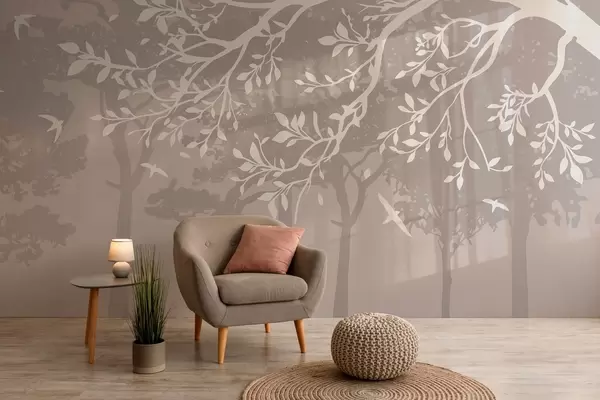 Valokuvatapetti kermanvärisen puun oksan siluetti lintujen kanssa metsän taustalla Nr w03116