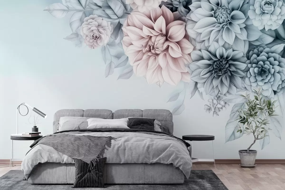 Valokuvatapetti krysanteemikimppu harmaansinisellä pohjalla Nr w03118