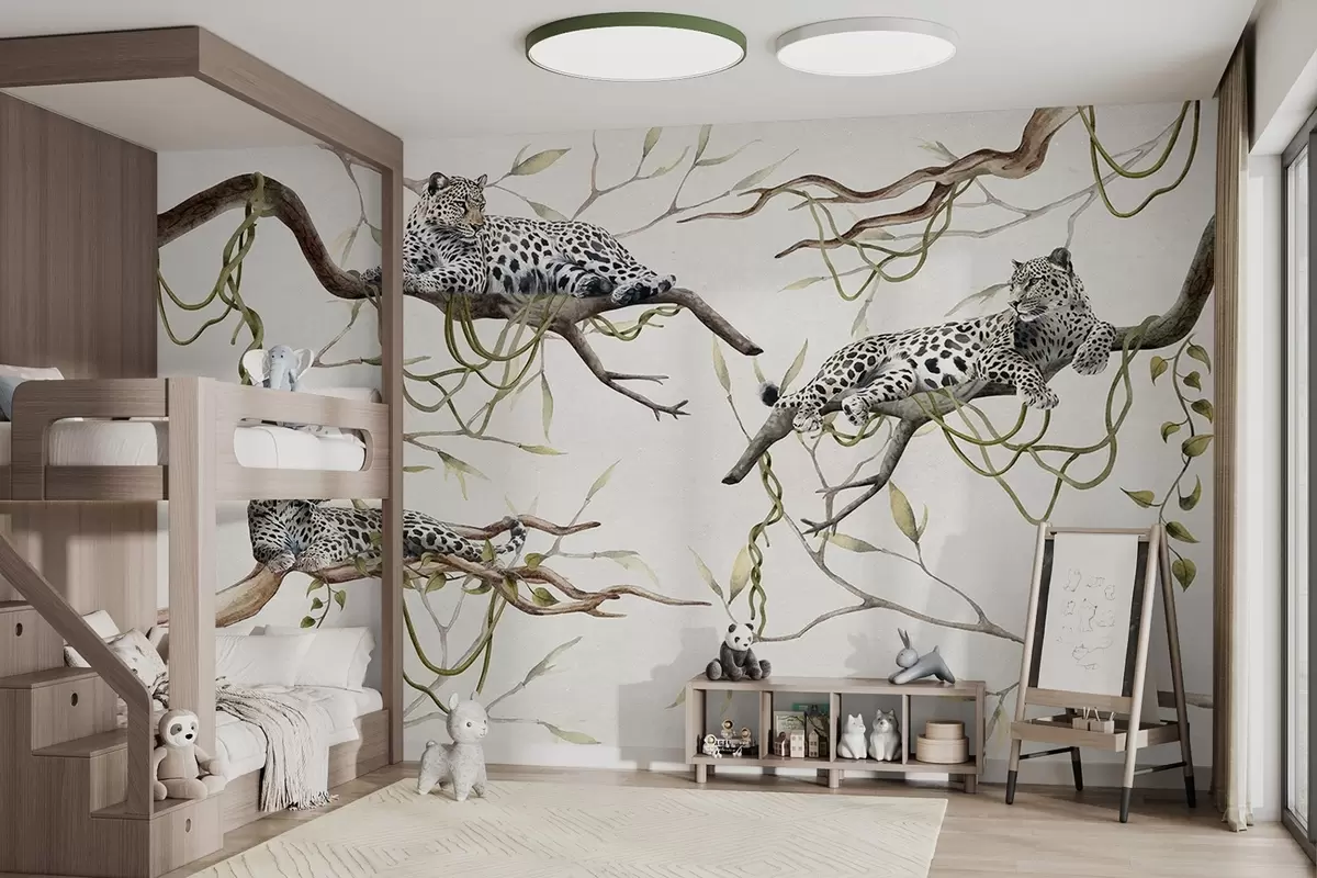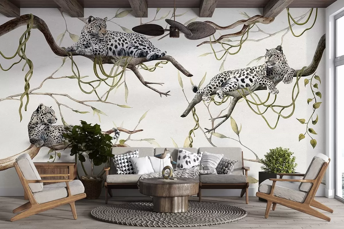 Valokuvatapetti Leopardit viidakon puissa, liaanit, trooppinen, villieläimet, pastellivärimaailman paletti Nr w03146v4