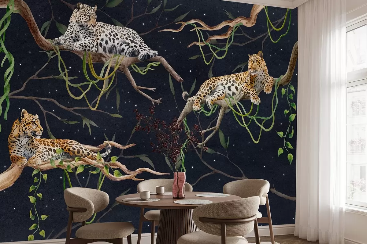 Valokuvatapetti Leopardit viidakon puissa, liaanit, trooppinen, villieläimet, yötaivas tähtien kanssa Nr w03148