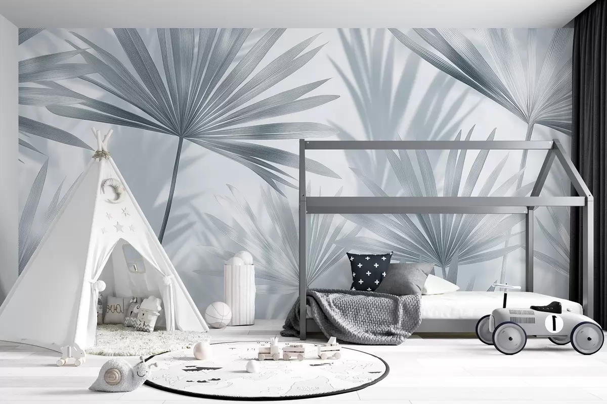 Valokuvatapetti Palmunlehdet, kukkakuvio, minimalismi, trooppinen, harmaat värit Nr w03152v1