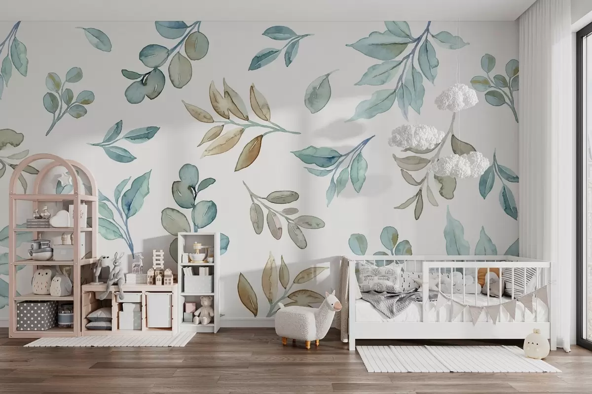 Valokuvatapetti erilaisia lehtiä ja oksia vesiväritekniikalla sinisen ja beigen sävyillä valkoisella pohjalla Nr w03280